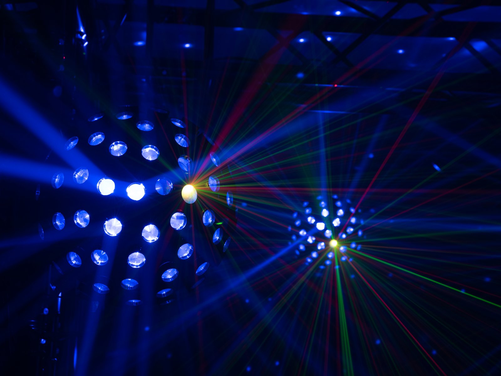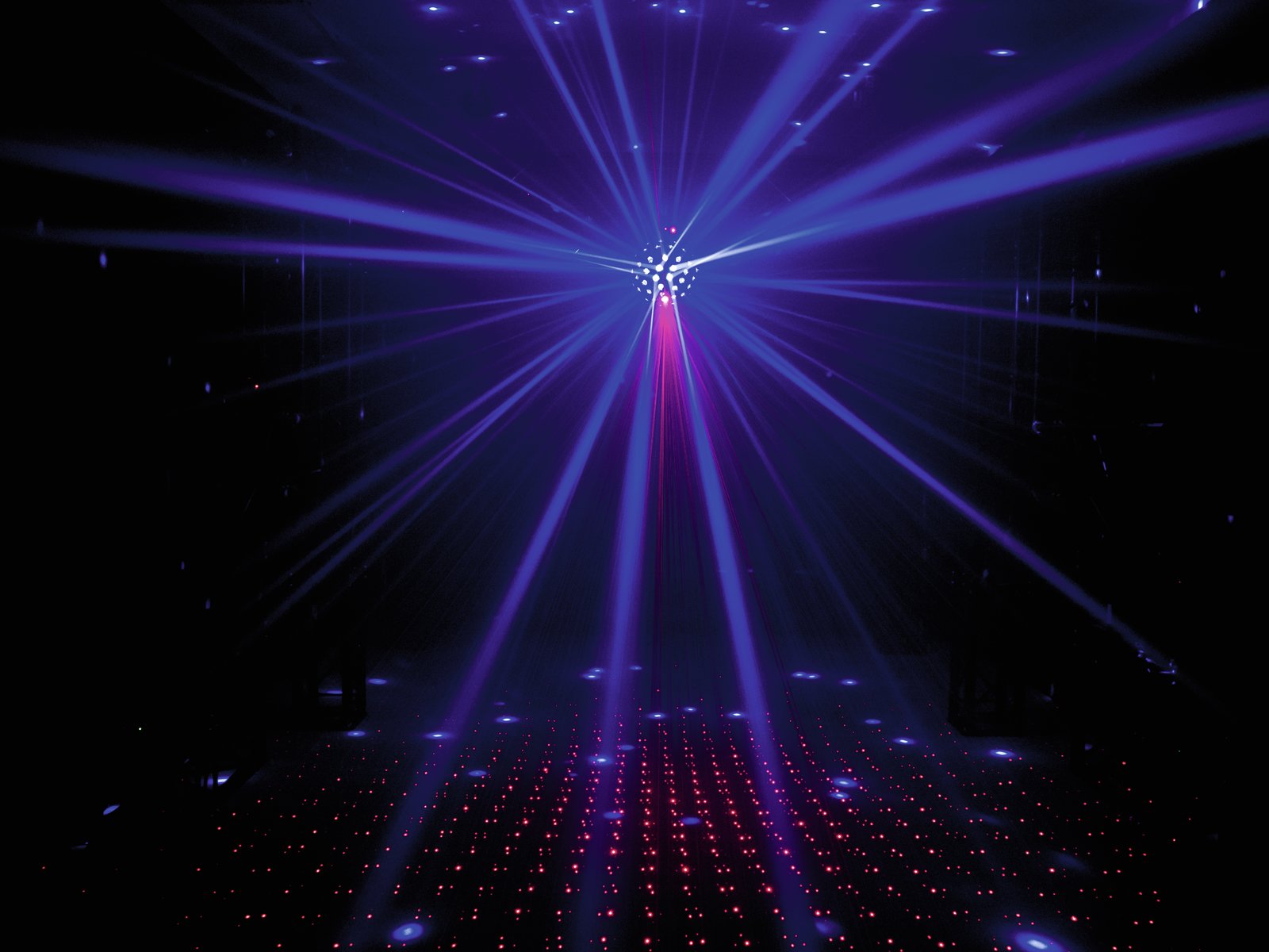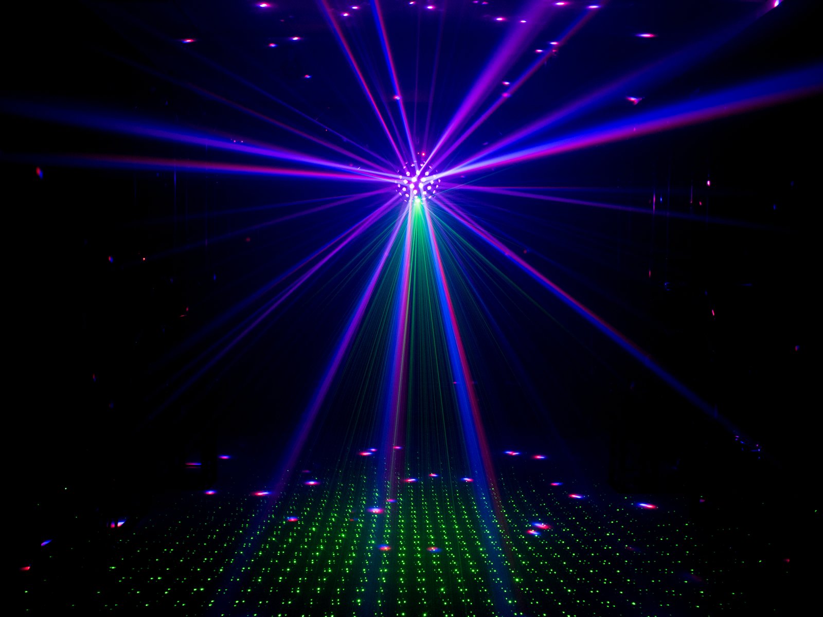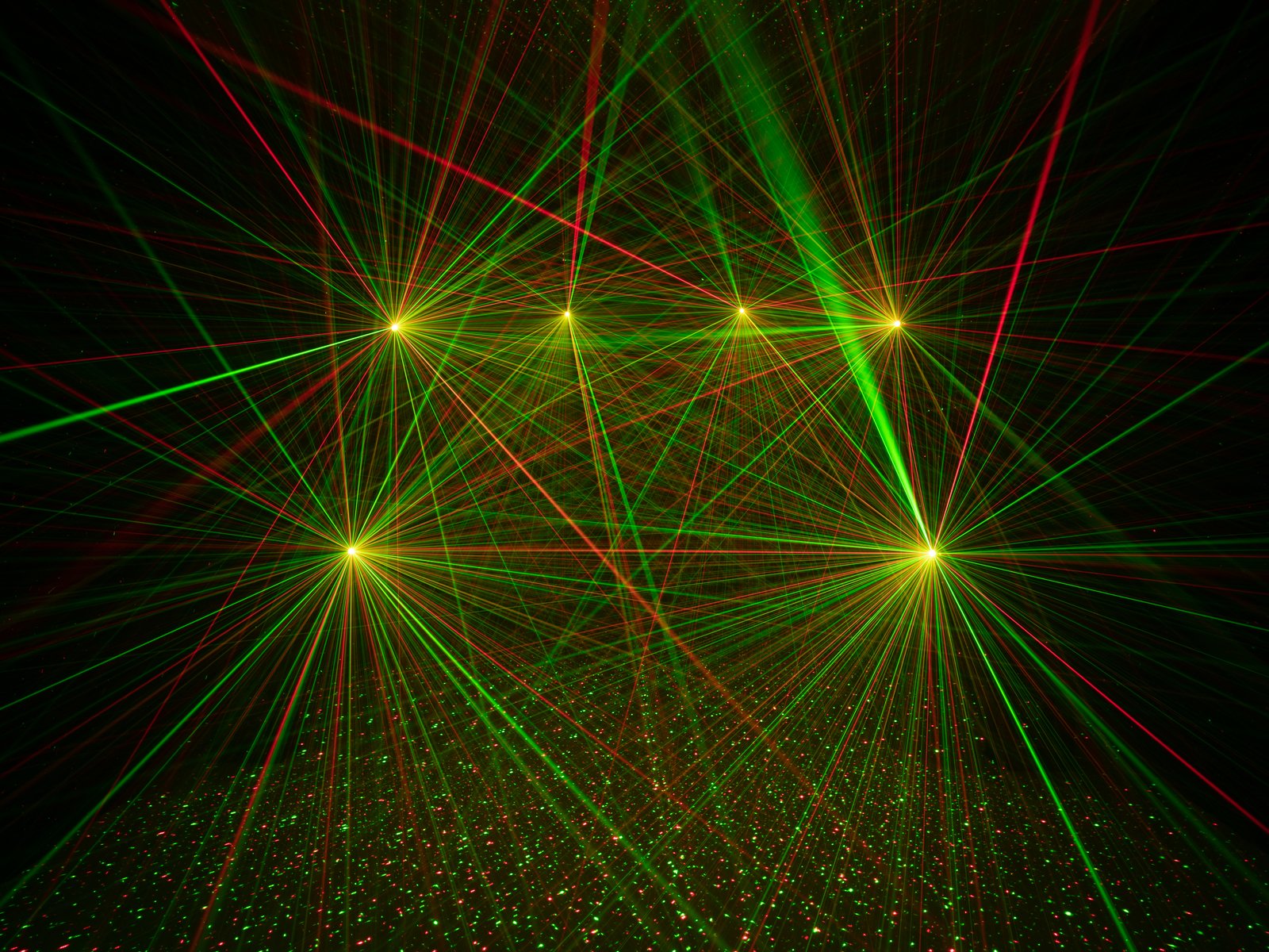 - 2 laser diodes project hundreds of red and green laser beams
