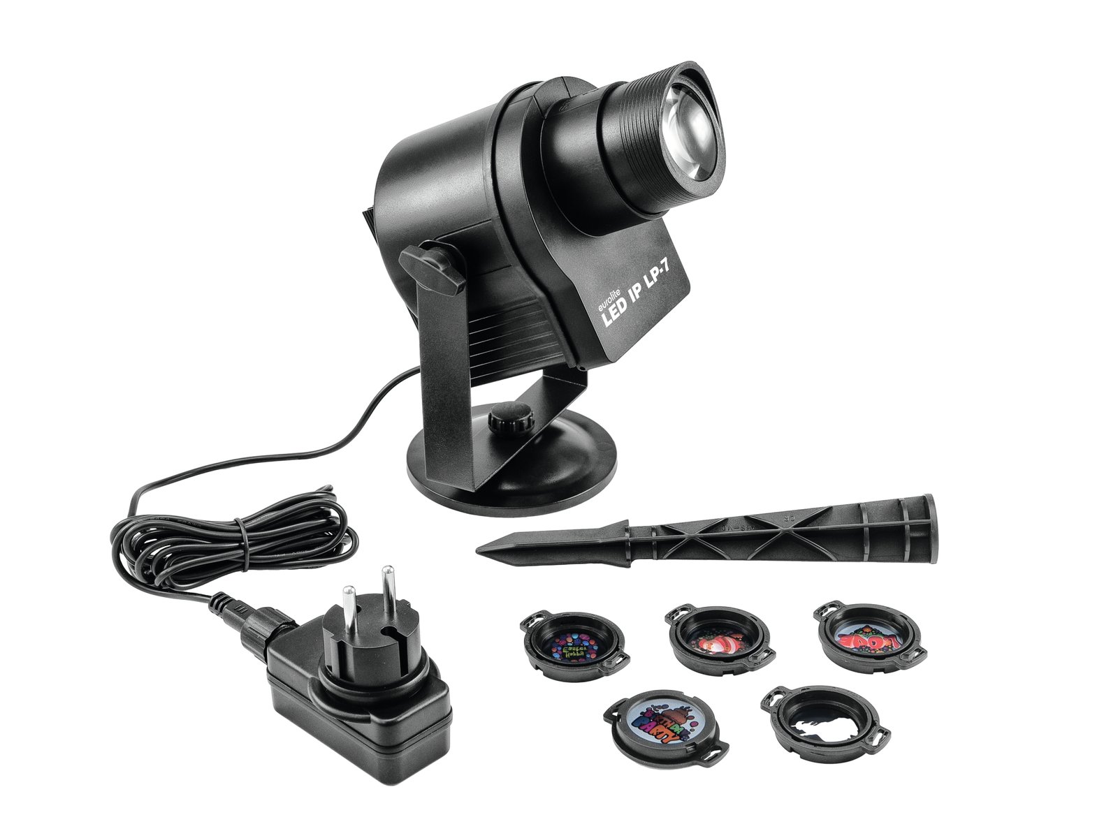 - 1 x device, 1 x external mains adapter, 6 x gobos, 3 x knurled screw, 1 x stake, 1 x holder, 1 x user manual