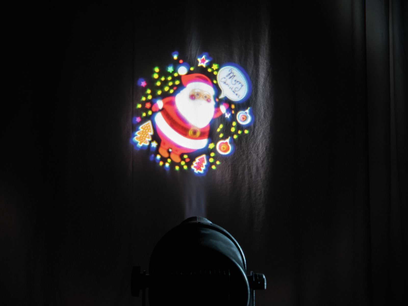 - Delivery includes 6 gobos with designs for Easter, Christmas, Halloween, New Year, wedding and birthday