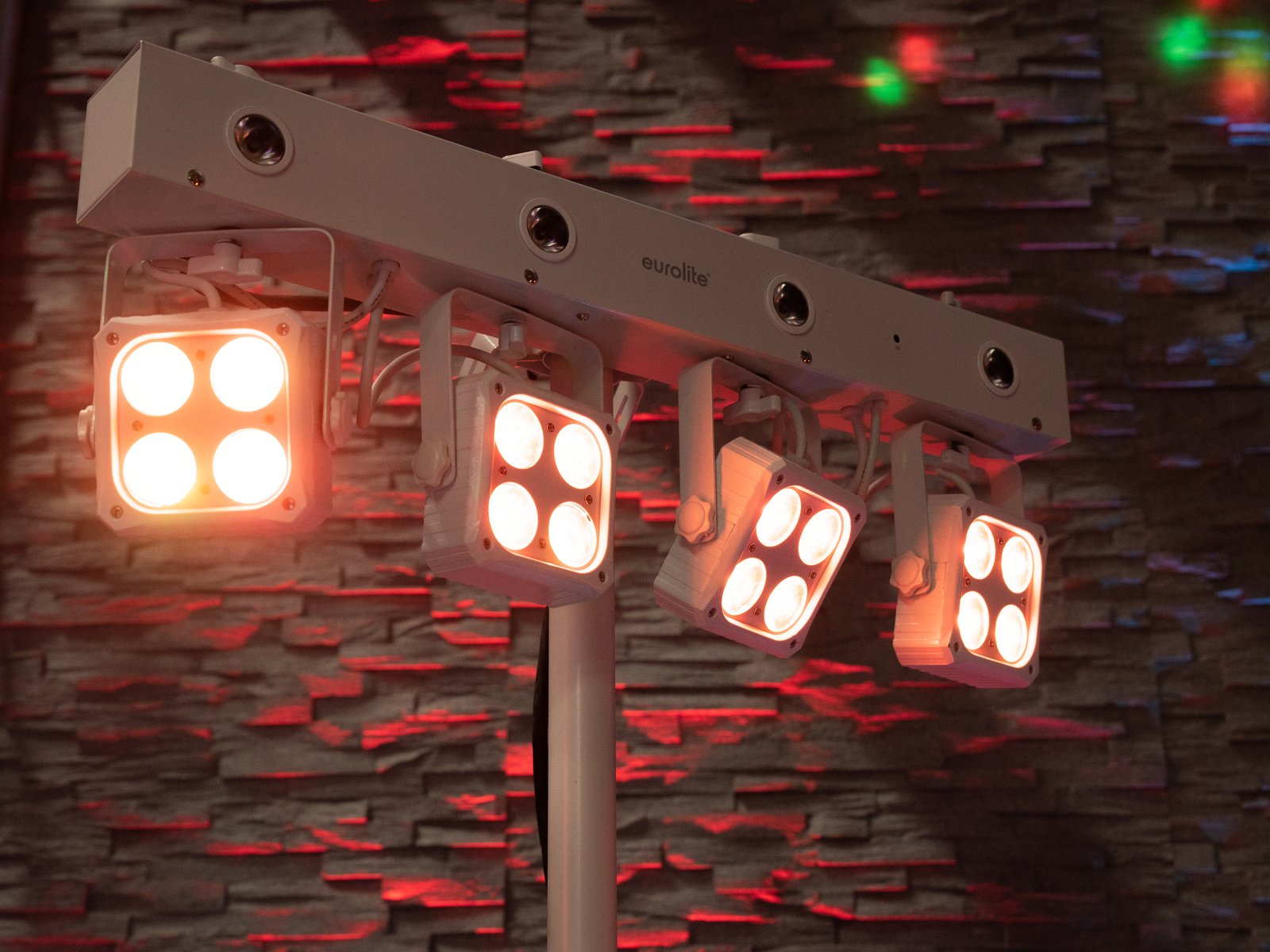 Bar with 4 RGBW spots and 4 white strobe LEDs, with QuickDMX connector (XLR)