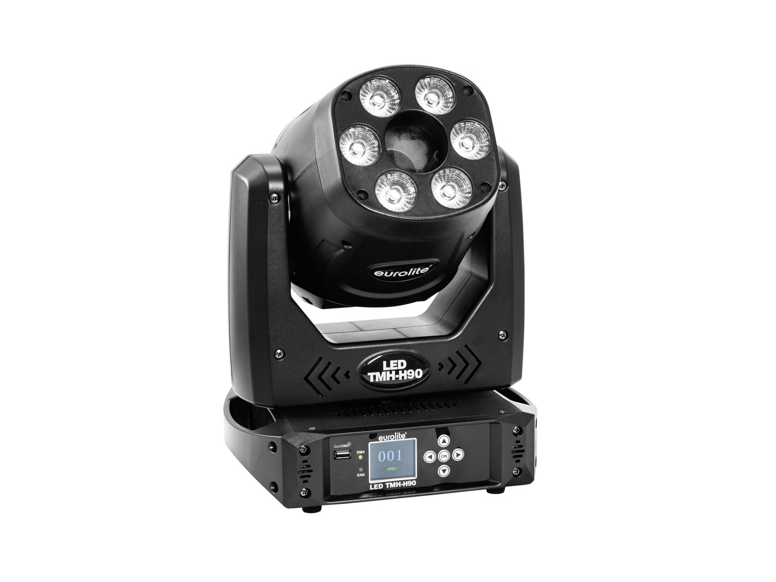 Spotlight and washlight: the TMH-H90 from Eurolite is both. Inside, it’s a full-featured spotlight with extensive features, and around its lens are 6 additional powerful 10-watt LEDs with a 6-color color mix. The result is a perfect combination of soft, colored light with a sharply focused beam shining in the middle.