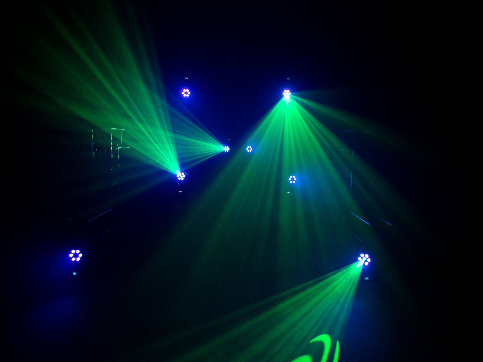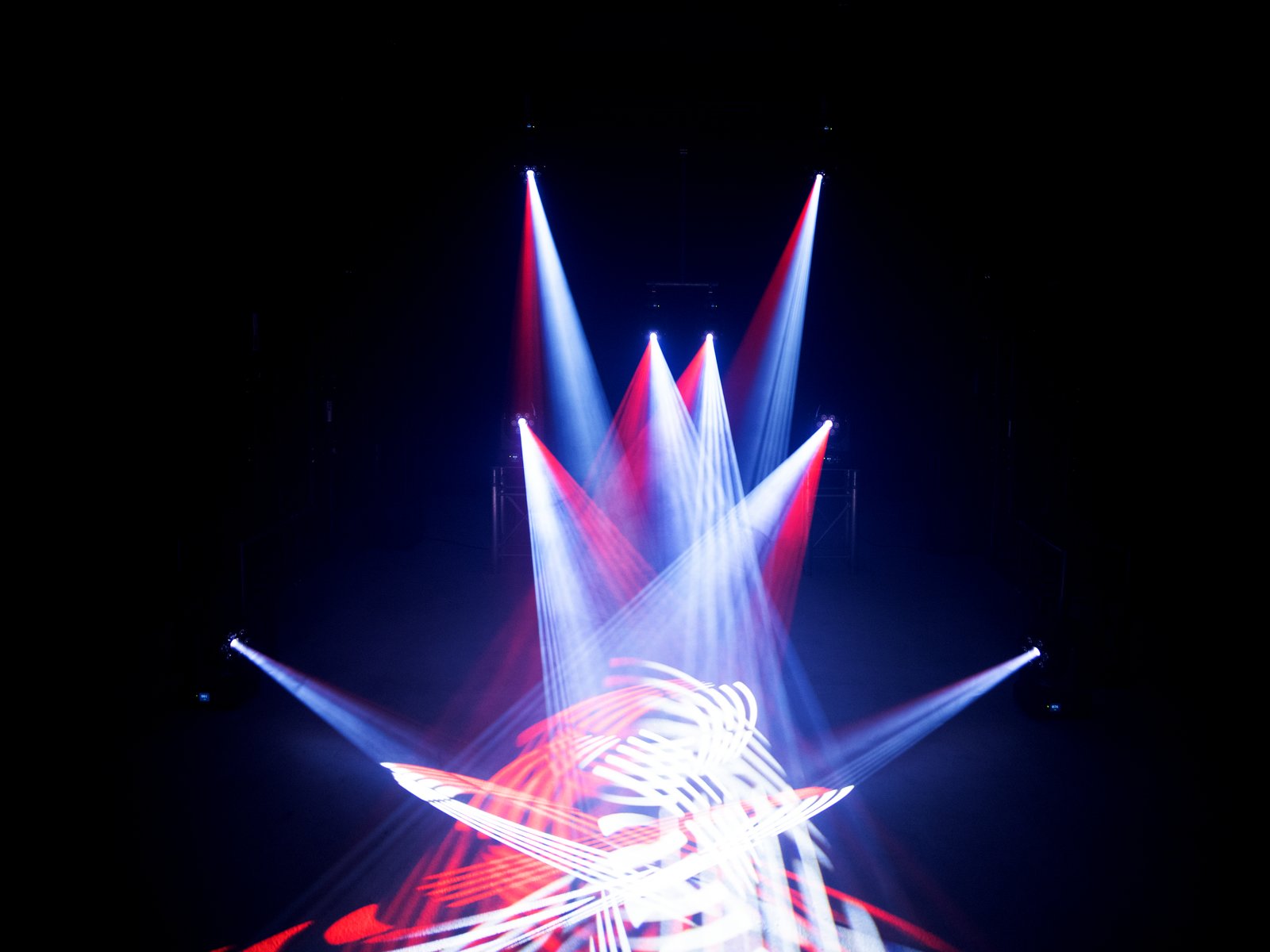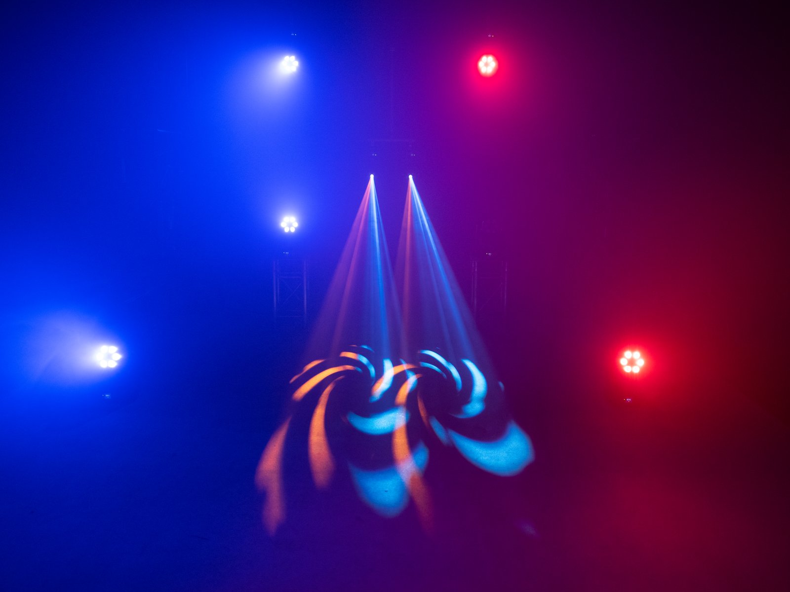 Further variations are created by the prism, which triples the image and can also rotate. The focus is adjusted via DMX, the focus is motorized. A color wheel with 7 dichroic color filters provides colors in the spot. Even two-color images are possible, as the color wheel can also be positioned in intermediate positions. A highlight is a three-color rotating gobo, which creates interesting color effects in combination with different colors.